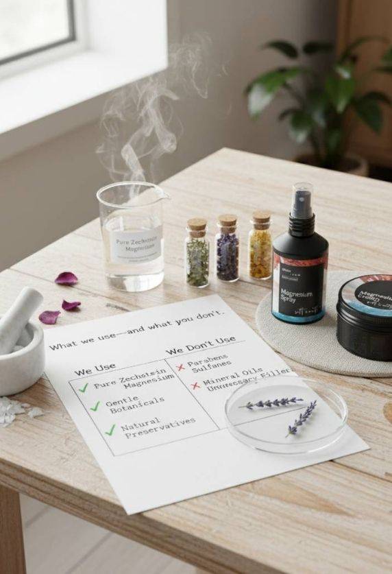 We’re proud of what’s inside our products: pure Zechstein magnesium, gentle botanicals, and natural preservatives with proven safety records. You won’t find parabens, sulfates, silicones, mineral oils, or unnecessary fillers here. If an ingredient doesn’t support your well-being, it doesn’t belong.